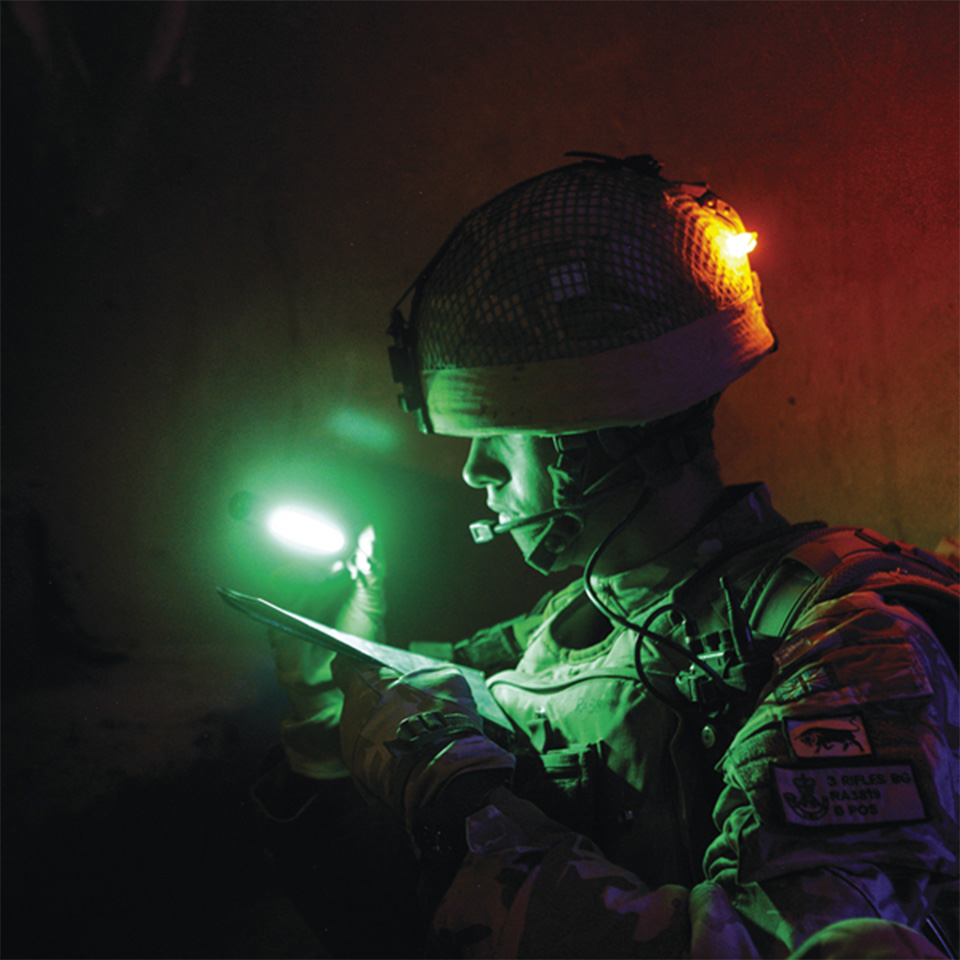 光の漏れを抑えつつ視認性を確保できるため、戦術環境における識別・マーキング・簡易照明に適しています。